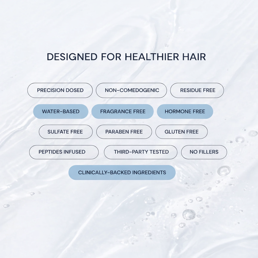 You can feel great about what you're applying. Our formula is vegan, cruelty-free, and completely hormone-free. We have also excluded harsh additives like parabens, sulfates, and silicones. Instead, we use high-quality botanical extracts and peptides to ensure a clean, effective experience for your hair and scalp health.